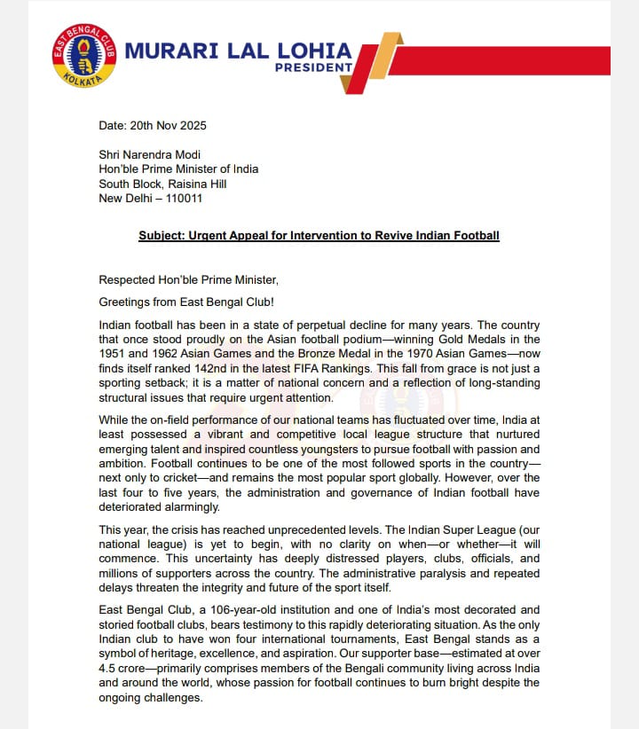 ভারতীয় ফু্টবলের জট কাটাতে দেশের প্রধানমন্ত্রীকে চিঠি ইস্টবেঙ্গলের। ক্লাবের সভাপতি মুরারি মোহন লোহিয়ার স্বাক্ষরিত চিঠি প্রধানমন্ত্রী নরেন্দ্র মোদির কাছে পাঠানো…